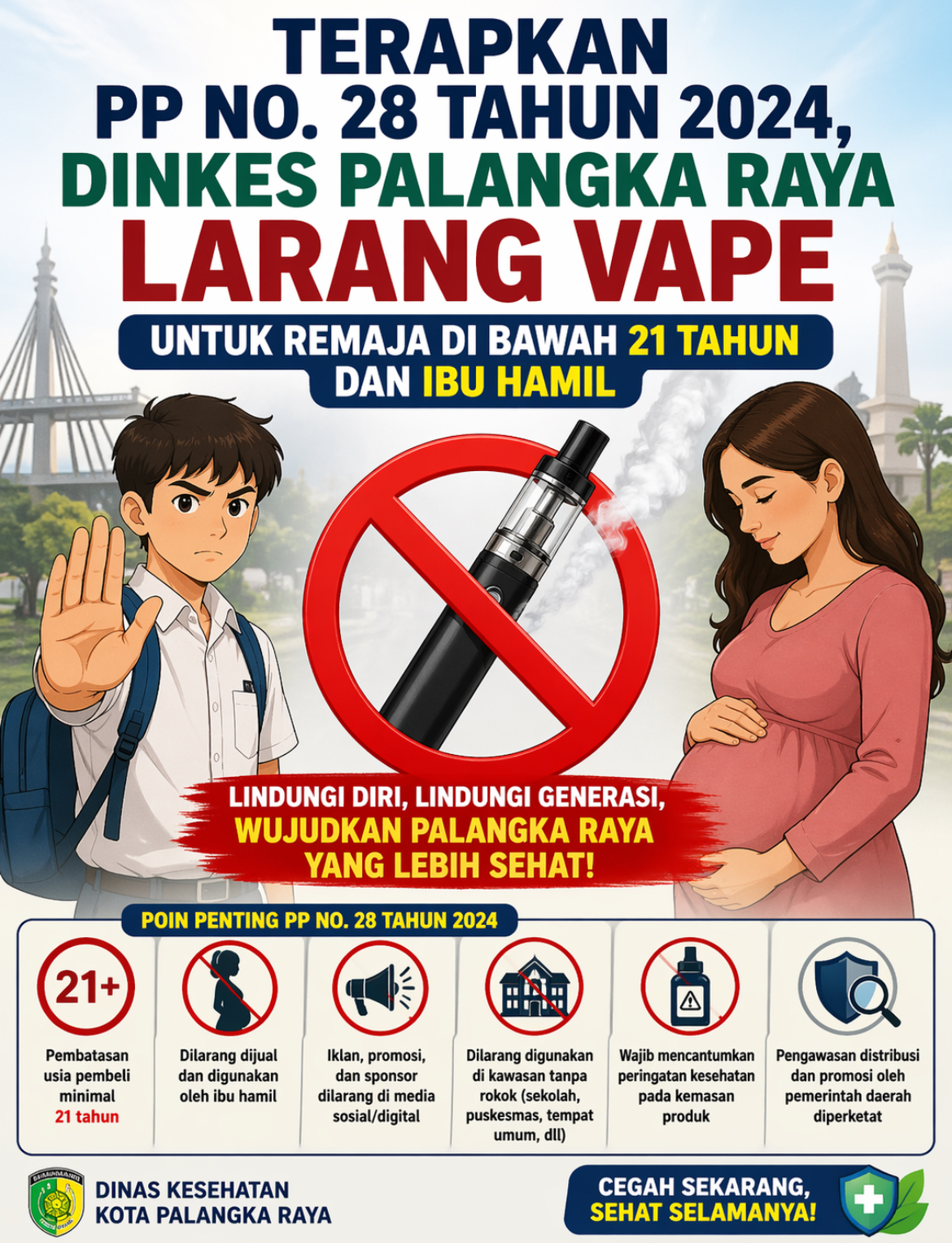 PALANGKA RAYA, INFOKALTENG – Dinas Kesehatan Kota Palangka Raya menegaskan larangan penggunaan dan penjualan rokok elektronik (vape) bagi remaja di bawah usia 21 tahun serta ibu hamil. Kebijakan ini merupakan tindak lanjut dari penerapan Peraturan Pemerintah (PP) Nomor 28 Tahun 2024 tentang penguatan pengawasan produk tembakau. Kepala Dinkes Kota Palangka Raya, Riduan, menyatakan pihaknya mendukung…