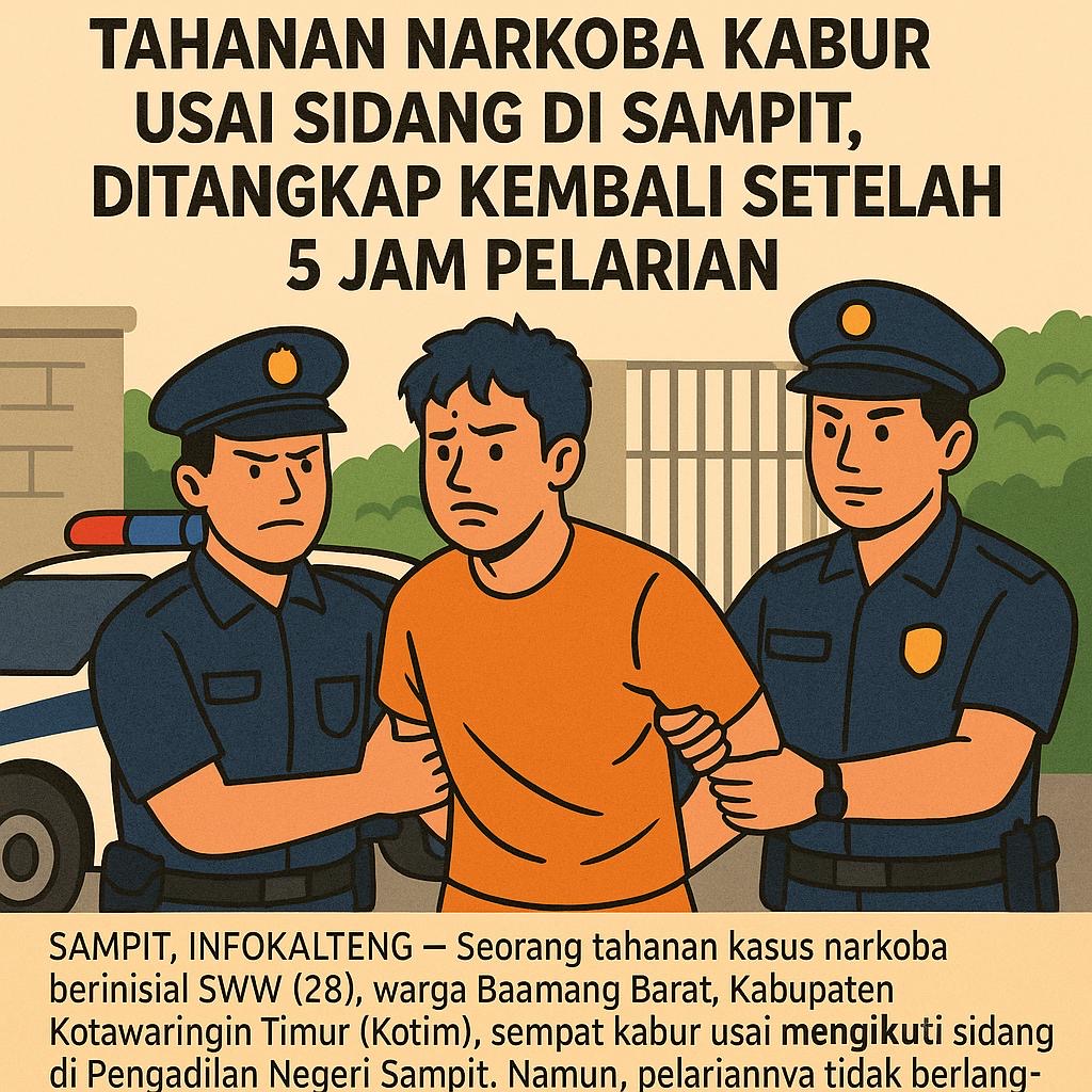 SAMPIT, INFOKALTENG – Seorang tahanan kasus narkoba berinisial SWW (28), warga Baamang Barat, Kabupaten Kotawaringin Timur (Kotim), sempat kabur usai mengikuti sidang di Pengadilan Negeri Sampit. Namun, pelariannya tidak berlangsung lama. Ia berhasil diringkus kembali sekitar lima jam kemudian, kurang dari satu kilometer dari Lapas Kelas IIB Sampit.
